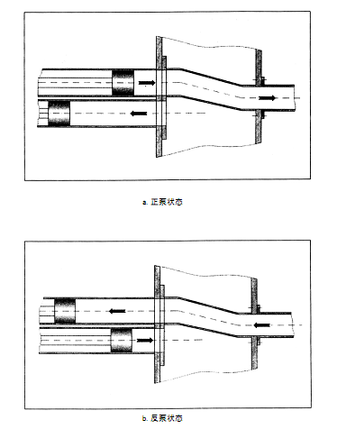 當(dāng)混凝土活塞8后退至行程終端時(shí),觸發(fā)水箱3中的換向裝置4,主油缸1、2換向,同時(shí)擺動(dòng)油缸12、13換向,使分配閥10與混凝土缸6連通,混凝土缸5與料斗連通,這時(shí)活塞7后退,8前進(jìn)。如此循環(huán),從而實(shí)現(xiàn)連續(xù)泵送。反泵時(shí),通過(guò)反泵操作,使處在吸入行程的混凝土缸與分配閥連通,處在推送行程的混凝土缸與料斗連通,從而將管路中的混凝土抽回料斗(如圖所示)