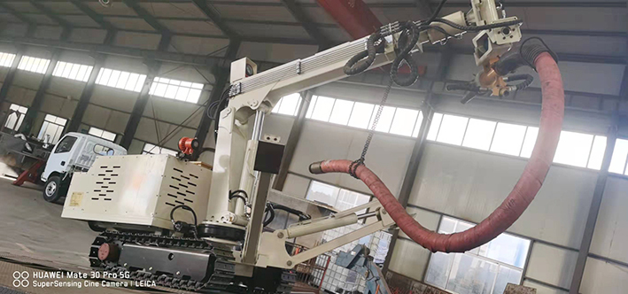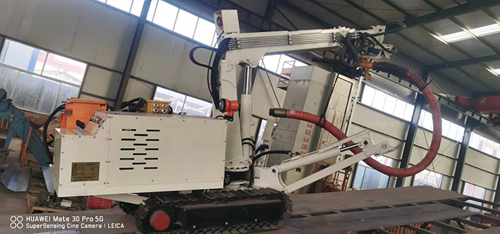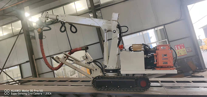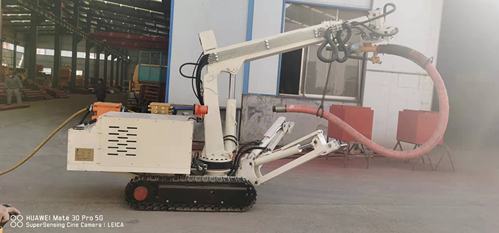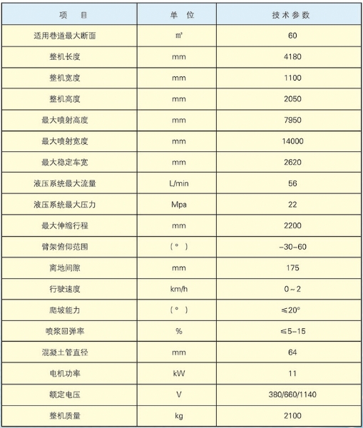 CPF-6OLY型礦用混凝土輔助噴射車(以下簡(jiǎn)稱噴漿機(jī)械手)主要用于煤礦井下煤巷、半煤巷、全巖石掘進(jìn)巷道與混凝土噴射機(jī)配套使用,代替人工噴漿作業(yè),滿足噴漿工藝要求,整機(jī)小巧、靈活、耐用、適應(yīng)能力強(qiáng),可用于大型噴漿機(jī)組無(wú)法進(jìn)入的巷道,實(shí)現(xiàn)噴漿無(wú)線操作、機(jī)械化作業(yè),減輕人工噴射勞動(dòng)強(qiáng)度大的問(wèn)題。整機(jī)完全采用無(wú)線遙控操作、液壓控制,工作性能安全可靠。下車液壓系統(tǒng)負(fù)責(zé)行走、上車液壓系統(tǒng)負(fù)責(zé)噴射,上下車動(dòng)作手動(dòng)切換,防止誤操作。整機(jī)具有結(jié)構(gòu)穩(wěn)定可靠,動(dòng)作平穩(wěn),噴射范圍大,自由度多,遙控操作靈活,噴射平整度好,回彈少,噴射效率高、施工質(zhì)量好,可實(shí)現(xiàn)遠(yuǎn)程控制,操作人員可位于在可視情況好、粉塵濃度少,較為安全的位置操作,保證使用人員安全。
